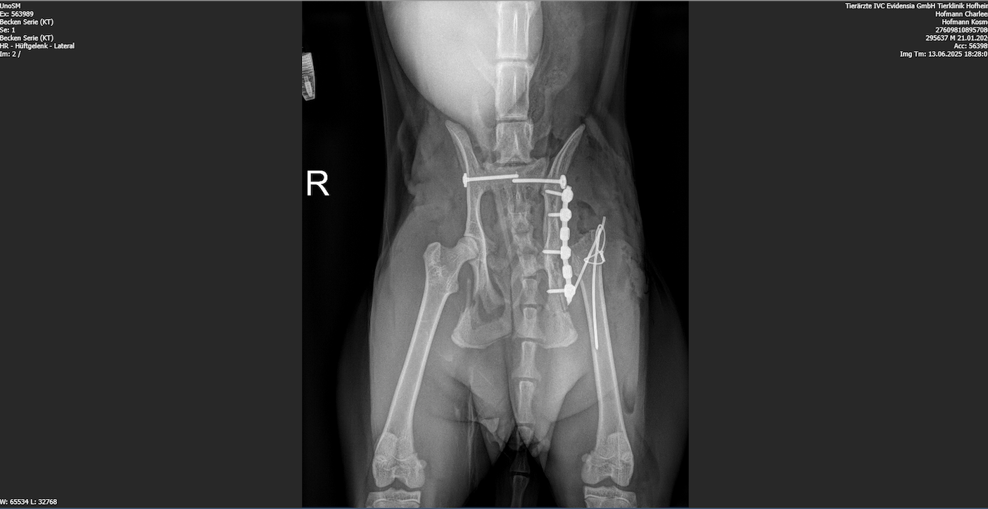 Die Bildgebung ergab multiple Beckenfrakturen, beidseitige Iliosakralgelenksluxationen, eine Beteiligung des linken Acetabulums, eine Läsion des linken Femurkopfes sowie eine mögliche Schwanzablösung im Bereich der ersten beiden Schwanzwirbel. Am Folgetag erfolgte die operative Versorgung mit bilateraler Stabilisierung der Iliosakralgelenke, Versorgung der Iliumfraktur inklusive Trochanter-Osteotomie und einer Femurkopf-Hals-Resektion links. Fünf Tage später wurde Kosmo zur physiotherapeutischen Erstvorstellung überwiesen.