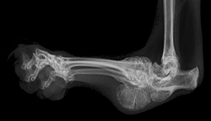 Exemplarisch wird der Fall einer Katze geschildert, die mit 24 Monaten zur Strahlentherapie vorgestellt wurde. Die Patientin sei schon immer schlecht gelaufen, mit Meloxicam als Bedarfsmedikation im Haus allerdings gut zurechtgekommen und habe den Wohnraum auf mehreren Ebenen genutzt. Das Springen auf Kratzbaum und Regale sei regelmäßig üblich gewesen. Innerhalb der vier Monate vor Erstvorstellung sei allerdings eine zunehmende Verschlechterung festzustellen, die trotz einer Erhöhung der Schmerzmedikation deutliche Auswirkungen hatte. Die Besitzer berichten eine deutlich reduzierte Bewegungsfreude, Sprünge über mehr als 50 cm Höhe seien die Ausnahme. Bei der allgemeinen Untersuchung zeigte sich die Katze ängstlich aber aufmerksam und auch bei der Palpation der Gelenke nicht aggressiv. Die Tarsalgelenke stellten sich klinisch deutlich verdickt dar, subjektiv schienen sie etwas verkürzt und geringgradig rotiert.