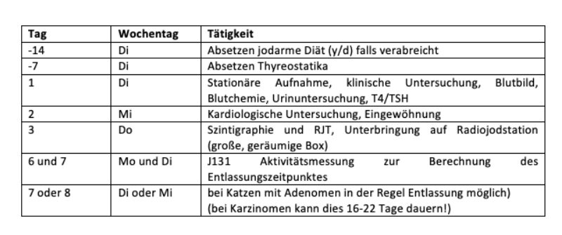 „Ideale“ Patienten für eine RJT sind Katzen, die noch eine Lebenserwartung von 2-3 Jahren und keine schweren Begleiterkrankungen (andere maligne Tumoren, chronische Nierenerkrankung im IRIS Stage 3-4 mit einem Kreatininwert von > 250 µmol/L bzw. > 2,9 mg/dl oder einen insulinplichtigen Diabetes mellitus) aufweisen. Nach Angaben der Literatur haben nicht-azotämische Katzen nach RJT eine mittlere Überlebenszeit von 4 Jahren, dagegen nur 2 Jahre unter Thyreostatikagabe. Da die Katze 4 Wochen nach RJT insbesondere über den Urin noch geringe Mengen an J131 ausscheidet, sollte sie für diesen Zeitraum in der Wohnung gehalten werden können.