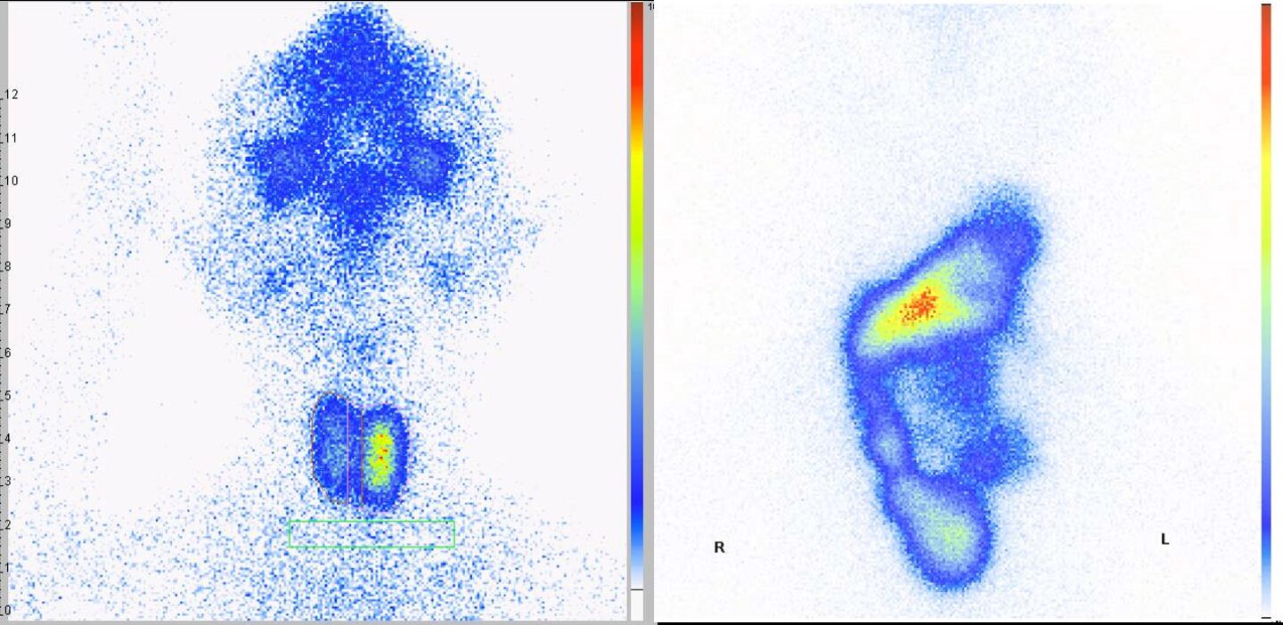 Die Schilddrüsenszintigraphie wird bei der Katze in der Regel als Voruntersuchung vor RJT durchgeführt, um die zur Therapie benötigte J131 Aktivität festzustellen und die Art des Tumors (Adenom vs. Karzinom, Abb. 2). Seltener ist die Szintigraphie (neben Ultraschall, Zytologie, der Bestimmung von T4/TSH und Ca++/Phosphat) zur Abklärung von Zubildungen im Halsbereich indiziert. Bei der Schilddrüsenszintigraphie der Katze werden ca. 30-40 MBq Tc-Pertechnetat intravenös verabreicht. Die Aufnahmen erfolgen 20-60 Minuten später mittels Gammakamera, wobei die Katze aus Gründen des Strahlenschutzes kurz sediert wird.