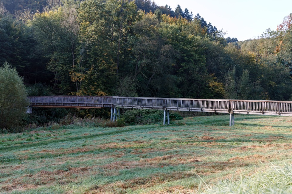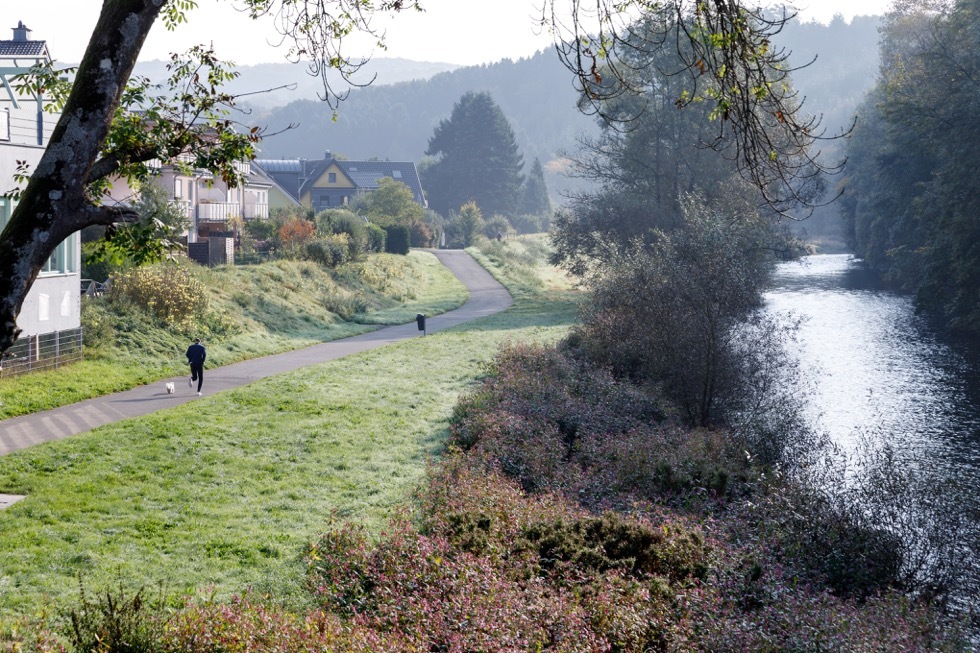 Sehr relaxt geht es auf dem befestigten Weg an der Agger entlang. Morgens scheint auf der stadtnahmen Seite die Sonne.