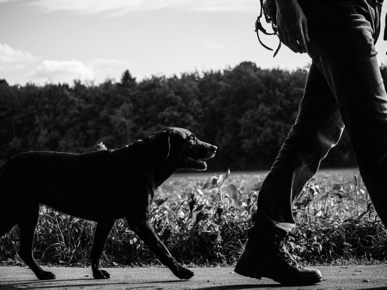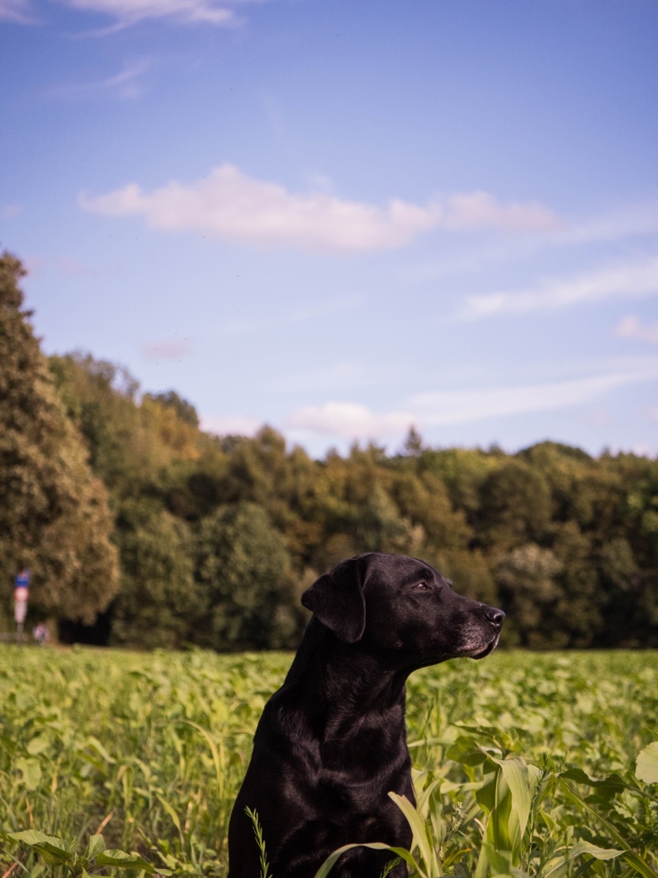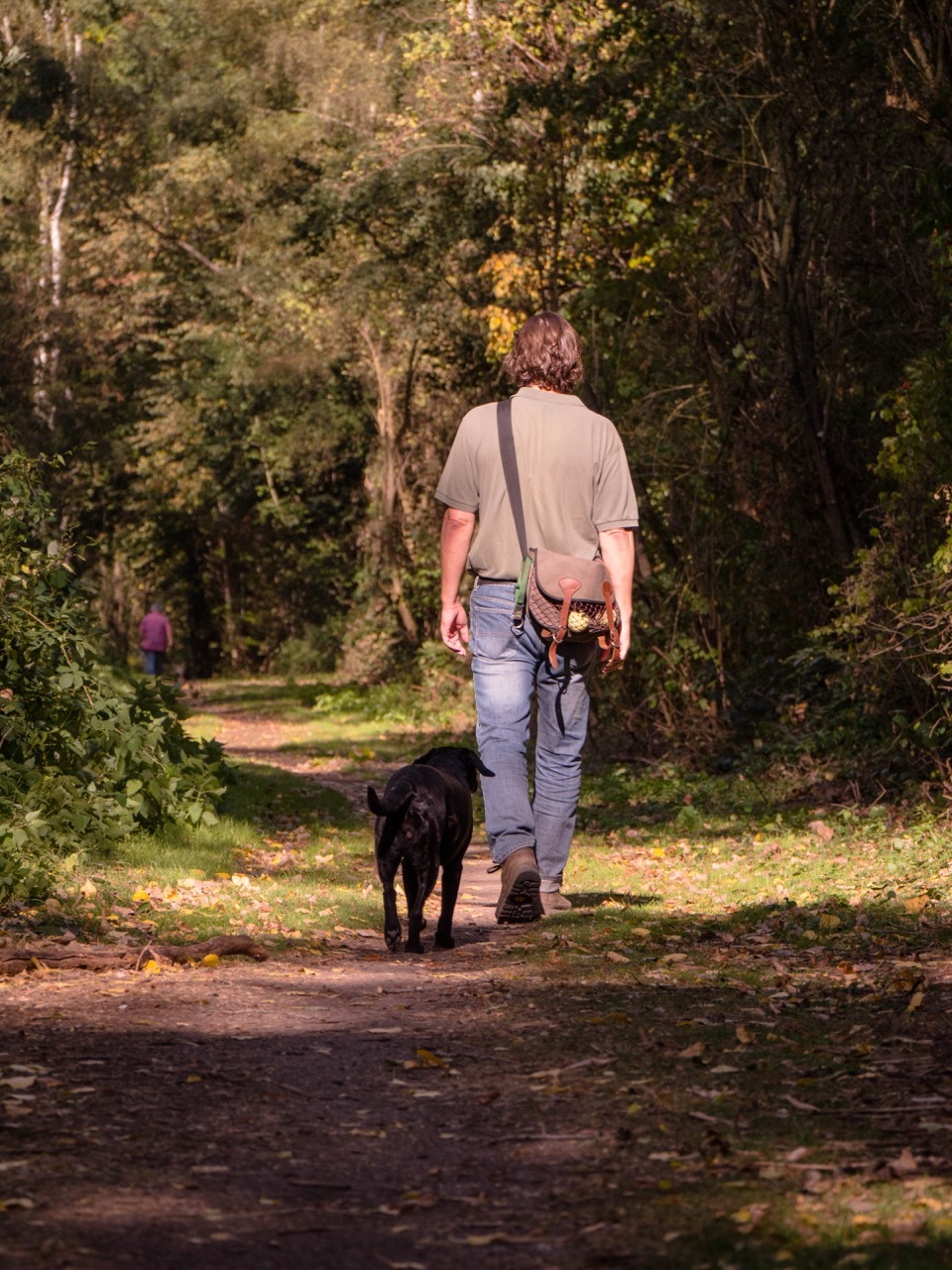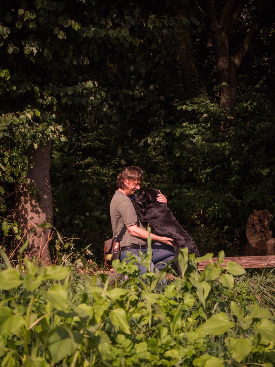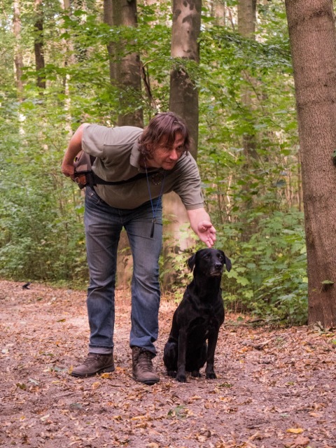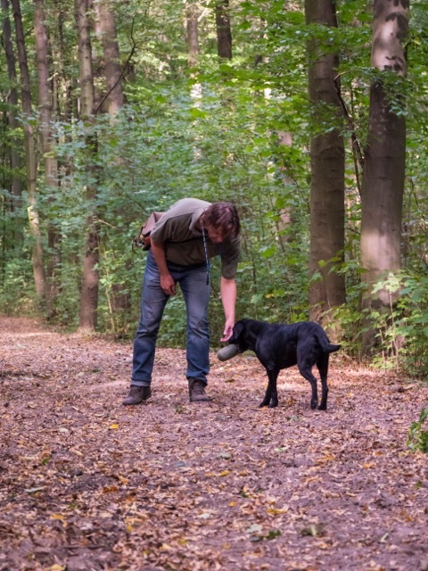 Die Hunderunde startet am Minigolfplatz in Rodenkirchen, der mit den Parkplätzen im Wendekreis einen guten Einstiegspunkt bietet. Dann geht’s ab in die Wiese – Jochen Schumacher hat auf dem Weg hierher einen Dummy, ein 500 g schweres Segeltuchsäckchen, versteckt und schickt seine Hündin Flame los. Für den Labrador ist es ein Leichtes: Sie hat sich gemerkt, wo vor einer halben Stunde das Spielzeug abgelegt wurde, läuft zielgerichtet über die Wiese, stöbert es auf und bringt es zurück. Auf dem Pfad durch die Wiesen geht’s weiter und kurz bevor es in bebautes Gebiet kommt, biegt der Jäger links ab und kommt in den Wald.