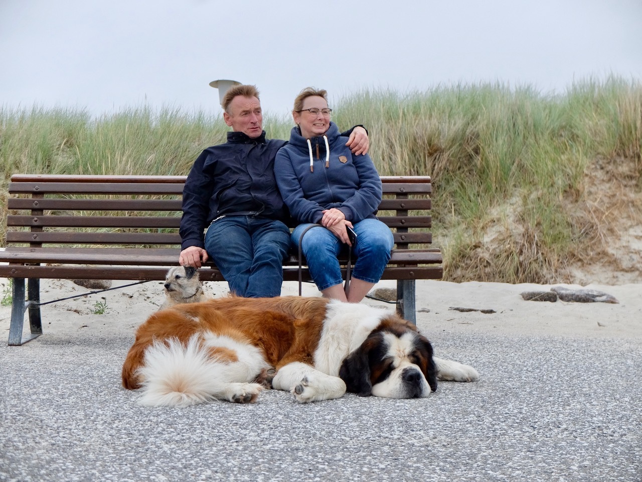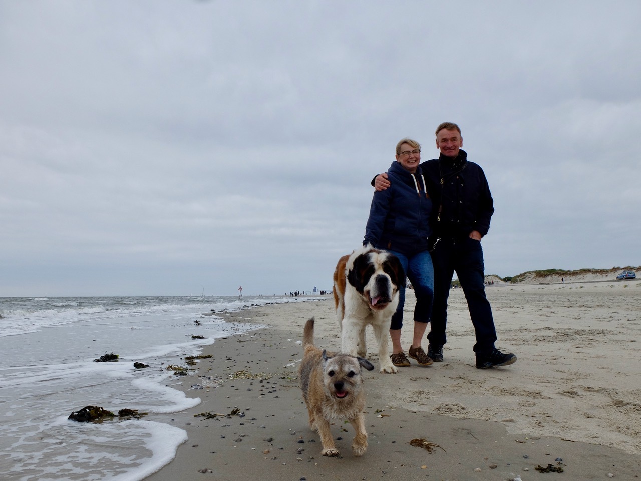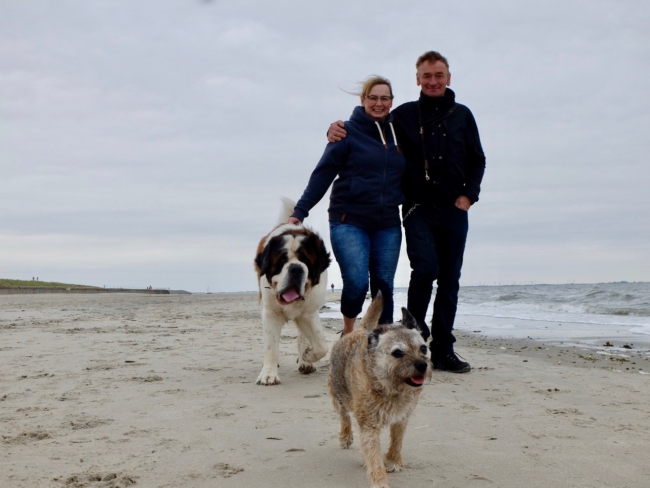 "Norderney ist die absolute Hundeinsel", lautet die Meinung von Nicole und Ewald Lohoff aus Recklinghausen. Schon zum dritten Mal verbringen sie ihren Jahresurlaub auf der Nordseeinsel. Mit dabei sind immer ihre beiden Hunde - Bernhardiner Bobby (5) & Border Terrier Jule (11) - sowie zwei ihrer drei Pferde. "Unsere Hunde sind hier überall willkommen!" Am Weststrand drehen die vier nachmittags ihre Runde. Hier am Hundestrand haben die Hunde einiges zu entdecken. Natürlich ist ein Bad im Meer absolute Pflicht.