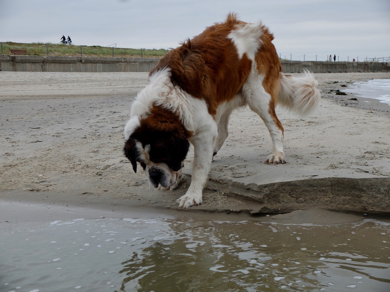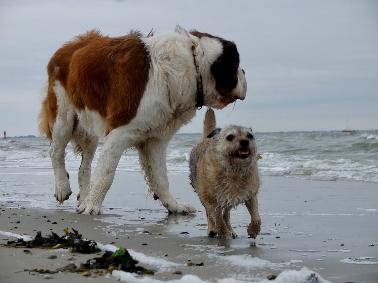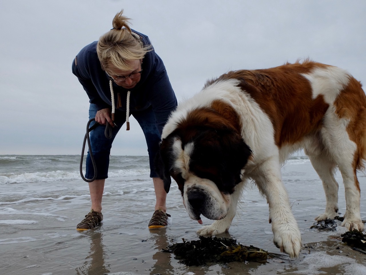 "Norderney ist die absolute Hundeinsel", lautet die Meinung von Nicole und Ewald Lohoff aus Recklinghausen. Schon zum dritten Mal verbringen sie ihren Jahresurlaub auf der Nordseeinsel. Mit dabei sind immer ihre beiden Hunde - Bernhardiner Bobby (5) & Border Terrier Jule (11) - sowie zwei ihrer drei Pferde. "Unsere Hunde sind hier überall willkommen!" Am Weststrand drehen die vier nachmittags ihre Runde. Hier am Hundestrand haben die Hunde einiges zu entdecken. Natürlich ist ein Bad im Meer absolute Pflicht.