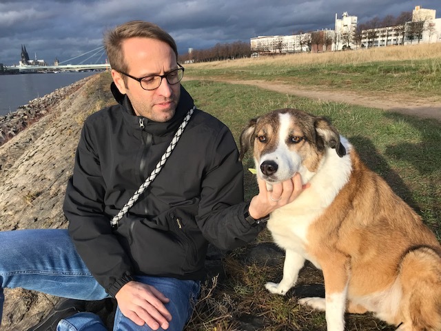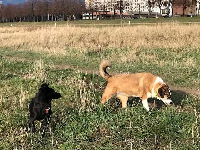 Die Pollerwiesen auf der "Schäl Sick", der rechten Kölner Rheinseite, bieten den Hunden ein abwechslungsreiches Terrain und den Besitzern einen herrlichen Blick auf Dom, Kranhäuser und Severinsbrücke.
